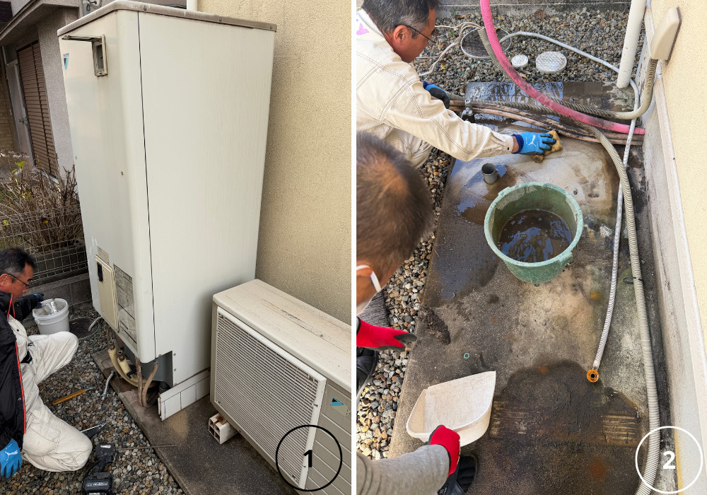 施行中 既存のエコキュートを撤去する前に、まずエコキュート内や浴室配管の水抜きを行います。そして古い配線やカバーなども職人さんが丁寧に取り除いていきます。