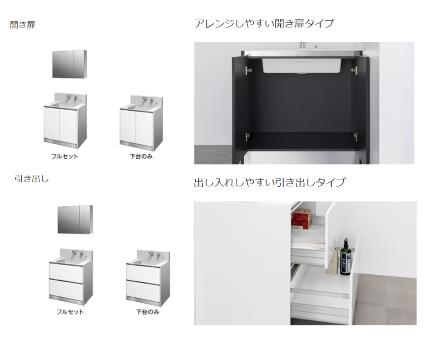 ■キャビネットバリエーション 開き戸タイプ:中の収納スペースの自由度が高く、市販のラックなども使ってレイアウトできます。 引き出しタイプ:上下2段の引き出しは、取手のないシンプルデザイン。手を掛けて奥までラクに引き出せます。