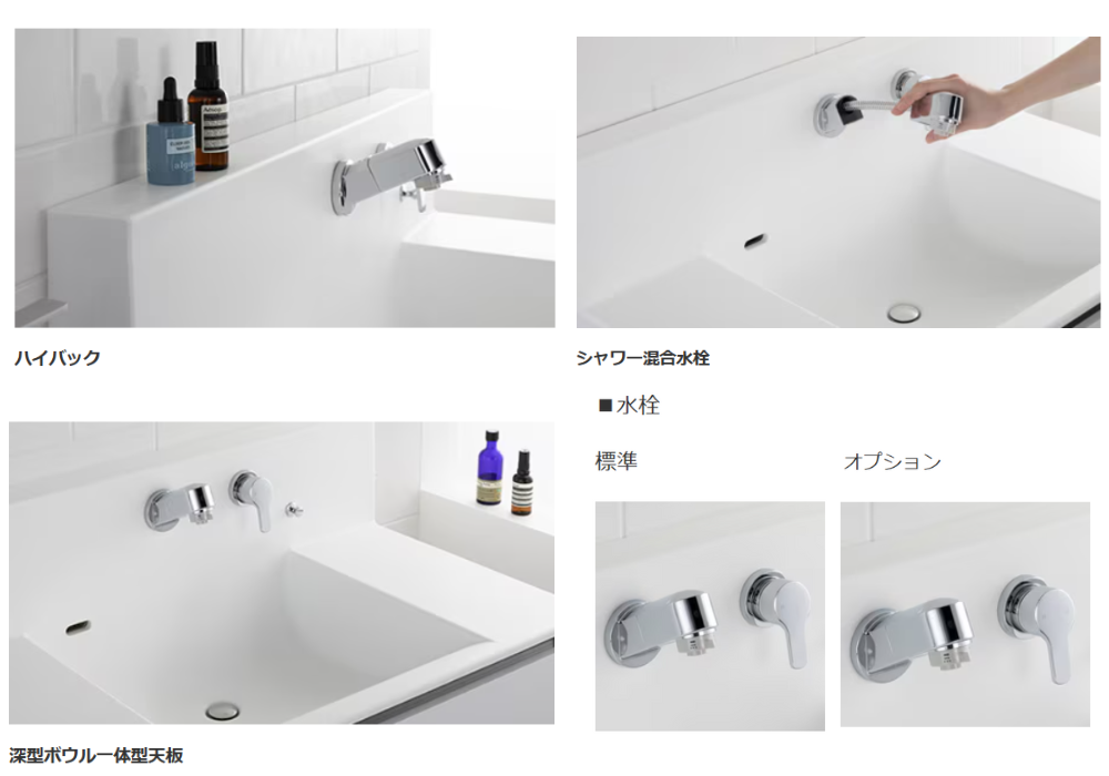 ■プレーンVアップライトの特徴(洗面ボウル/水栓) ハイバック:立上りの奥行きは7cm。コップやハンドソープが置けます。 深型ボウル一体型天板:清潔感あるマットな人工大理石天板。一体形成なので隙間がなく、お掃除ラクラク。 シャワー混合水栓:泡沫吐水に切り替えることができる、