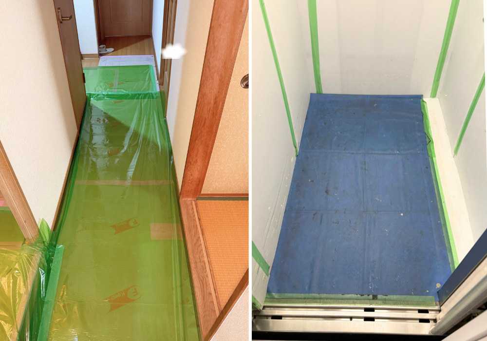 施行前の養生 リフォームを行う際は既存の物を傷つけないようにお家内や、マンションなら共同のエレベーターなどの運搬ルートに丁寧に養生を行います。