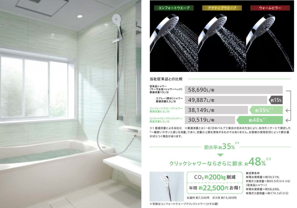 ■コンフォートシャワーバー(手すり兼用) 頭の真上からシャワーをたっぷり浴びられるシャワーで、想像以上に爽快な浴び心地を体感できます。好きな位置で自由に高さを固定でき、前出のアーチ形で手すりとしても使いやすいです。シャワーモードも3種類から選べ、節水機能付きです。