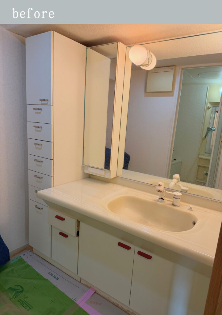 洗面台 施行前 広さがある洗面台でしたが収納量が少なく、水栓も古いものでしたので新しく取り換えを行っていきます。