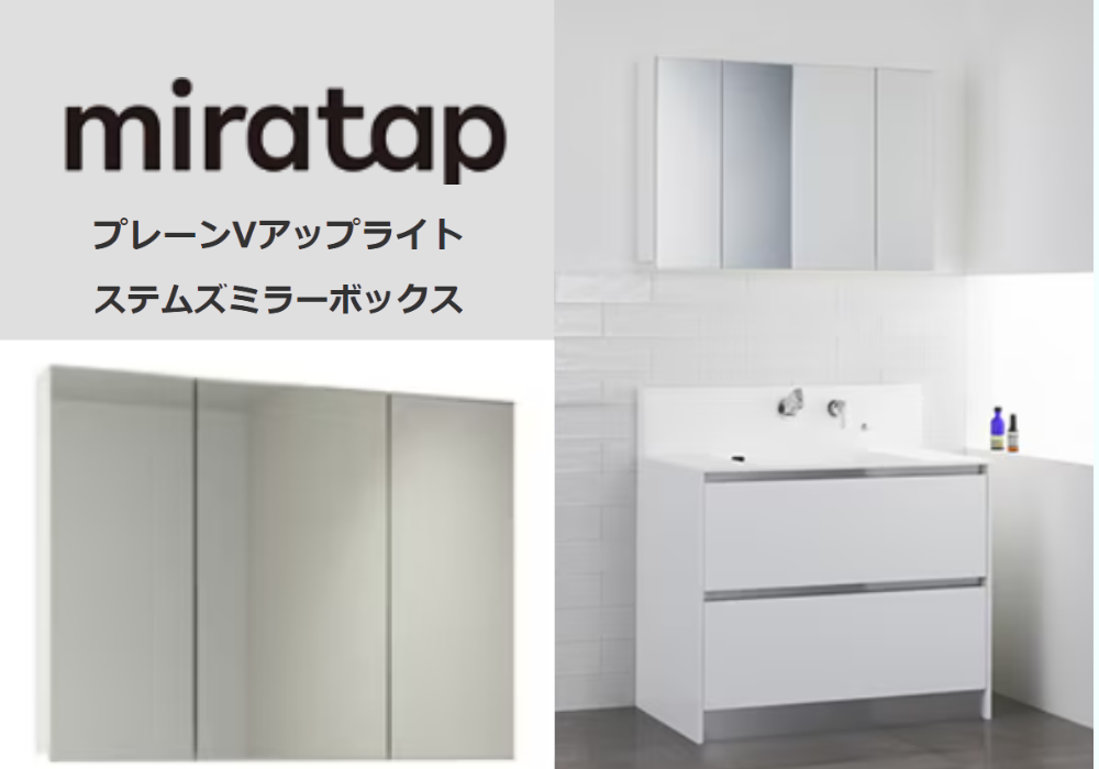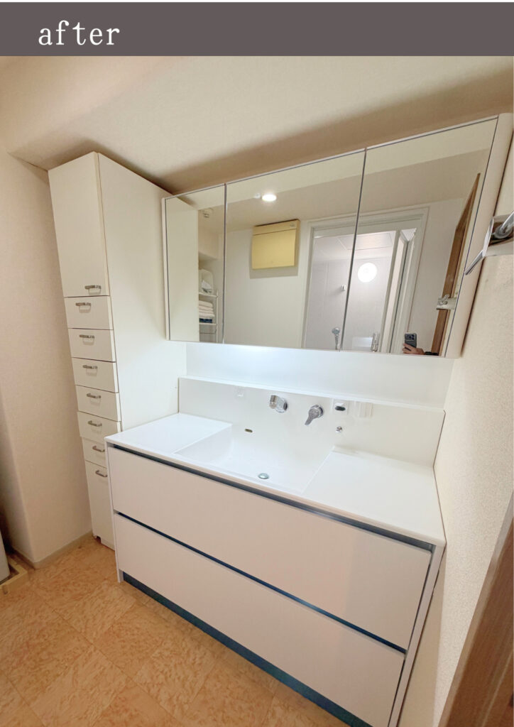 洗面台 施工後 採用したのは ■ミラタップ【ステムズミラーボックス/プレーンVアップライト】。 豊富な収納力を備えた3面鏡と、ワンランク上のオールインワン洗面台です。収納力が上がることで更に広々と使い勝手の良い洗面台になりました。