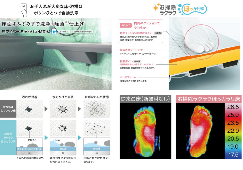 ■お掃除楽々ほっからり床 床表面に特殊処理を施した親水層の効果で、皮脂汚れと床の間に水が入り込み、汚れ落ちがスムーズに。ブラシでのお掃除がラクラクです。そしてW断熱構造で冷気をシャットアウトし、柔らかさと温かさを兼ね備えています。