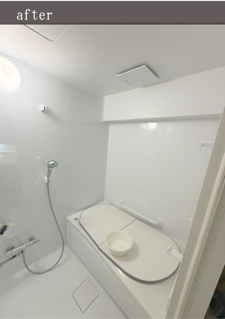 浴室 施工後 施行が完了しました。採用したのは ■TOTO【マンションリモデルバスルームWTシリーズ のホワイト】です。マンション用の商品なので、浴室と外壁の間のデッドスペースを最小限に抑えてピッタリサイズにリフォームが可能な商品となっています◎