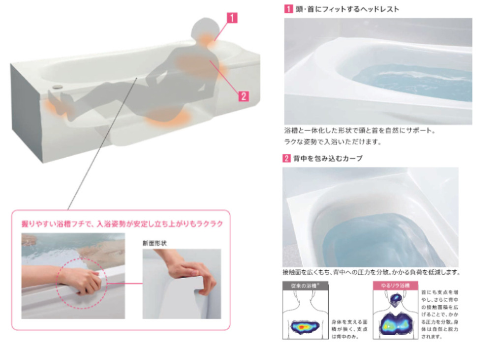 ■ゆるリラ浴槽 「気持ちいい」をとことん科学して生まれた、入る人をやさしく包み込む浴槽。頭と首をしっかり支え、背中を包み込み身体にかかる圧力が分散されるので、自然とリラックスする姿勢になれます。