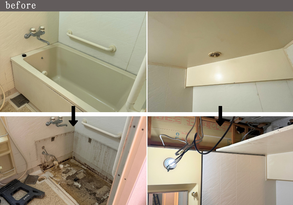 施行中 養生を行った後は解体に入ります。バスタブを外し、天井も配管等のやり替えのため丁寧に撤去していきます。