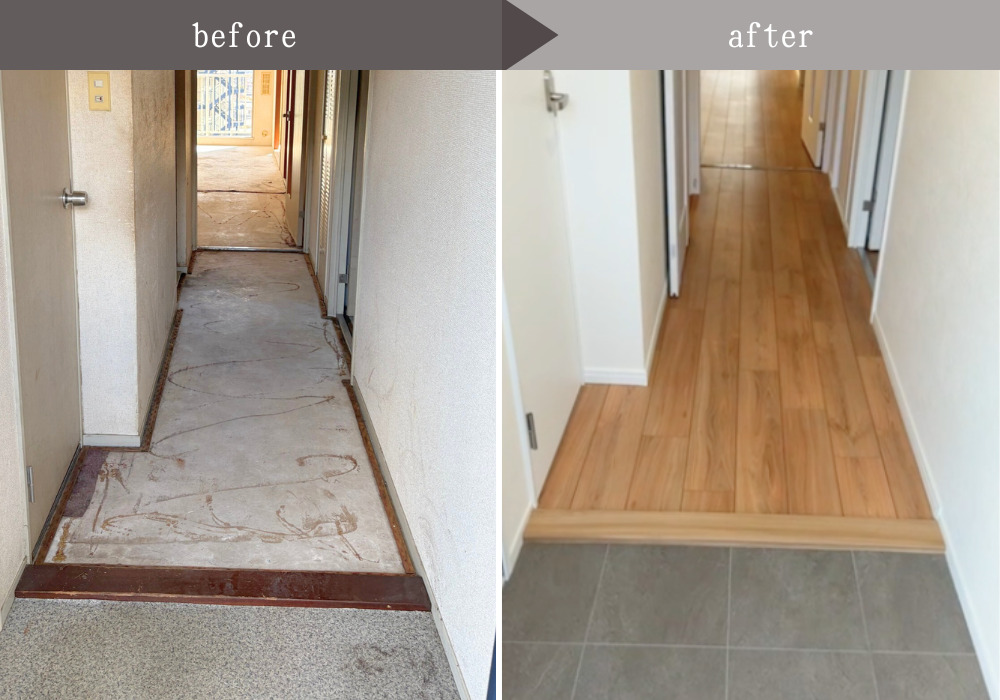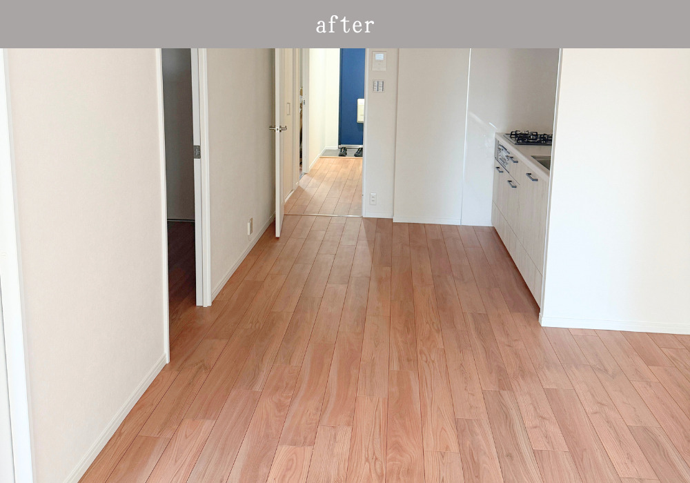 ⑤キッチン前 施行前後 こちらも同じフローリングとクロスを使用しています。キッチンも新しく取り換えていますが、別の記事でご紹介しますので是非チェックしてみてくださいね。