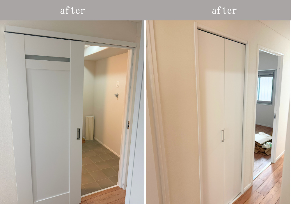 ③玄関右側洋室 建具 施行前後 ■建具 Panasonicベリティス お色はしっくいホワイト柄です。 両折れ戸のタイプはそのままで、人気のPanasonicの建具に取り替えを行いました。フルオープンできるので物の出し入れも楽々です。