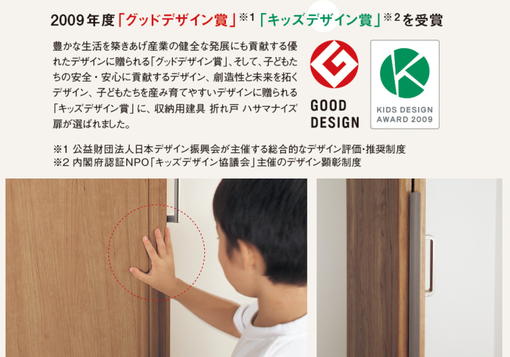 扉にすき間ができない設計の「ハサマナイズ機構」を採用することにより、よくあるお子さまの指はさみ事故を防ぎます。すき間に後付けできる「後付け保護カバー」もあります。