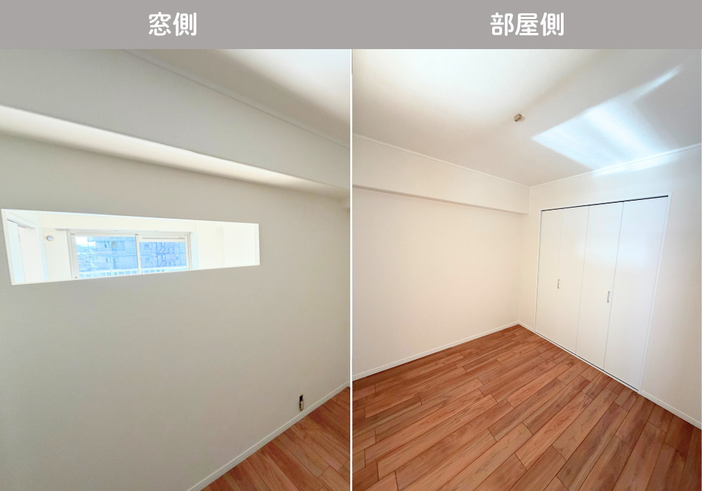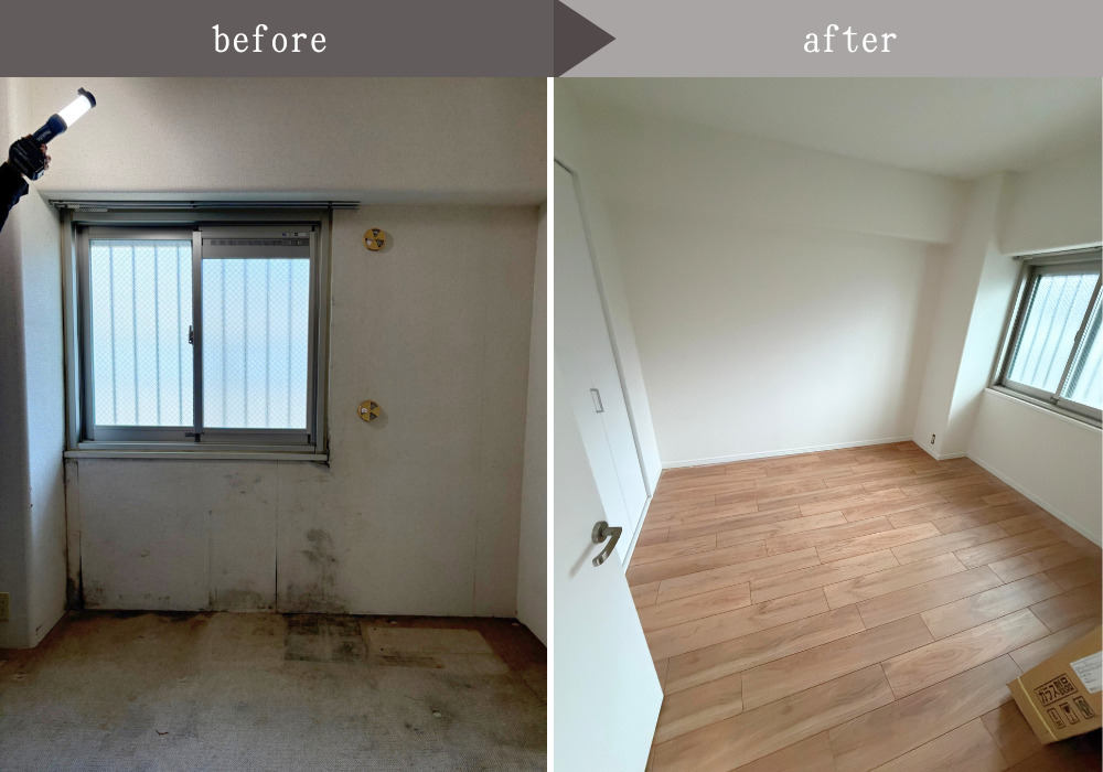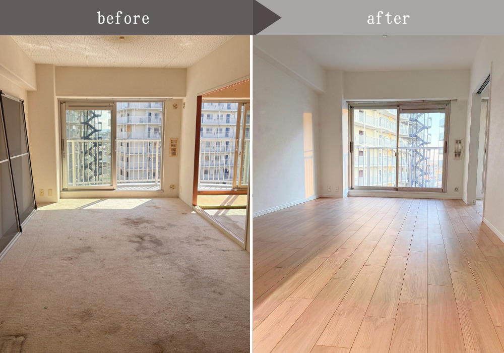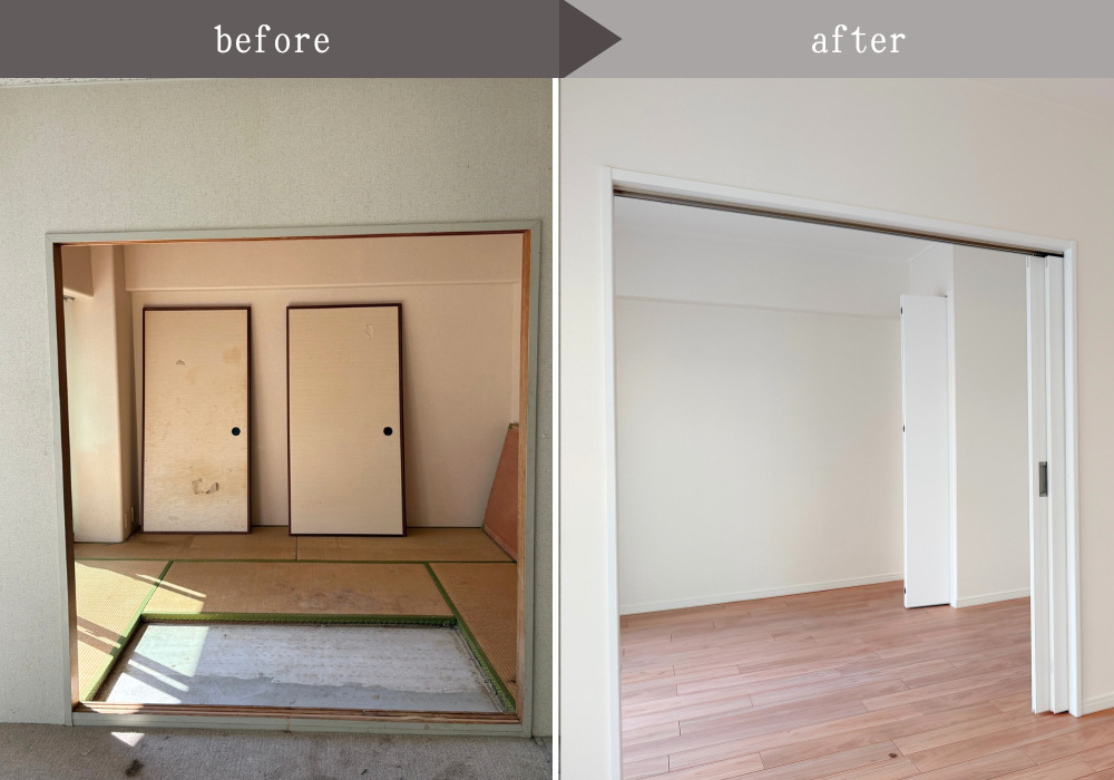 ⑥リビング横 和室 施行前後 元々が和室のお部屋でしたが洋室にリフォームしました。畳よりもお掃除しやすくなるためハウスダストなどアレルギーの心配を減らせます。リビングとの境目も無くなるため扉をオープンするとかなり開放感が出るのでおすすめです。