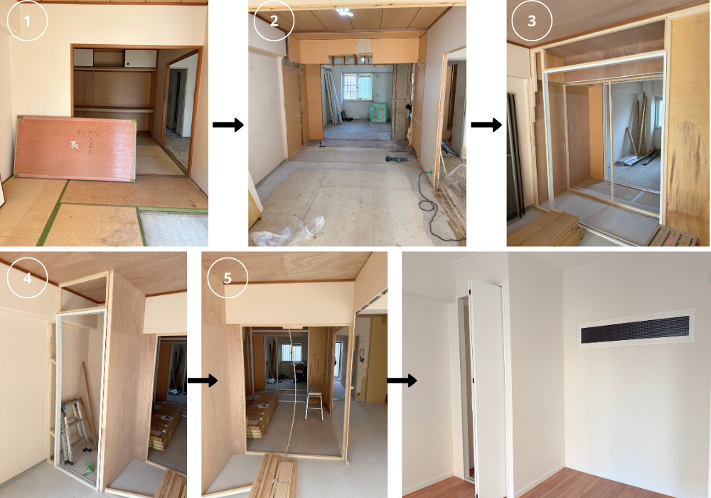 リビング横 3部屋分 施工前後 ①窓側から見た和室2部屋分②玄関横の部屋まで(3部屋分)壁を抜く③新しく壁を作っていく④建具の枠を作る④建具横の壁を作っていく。 奥の部屋は真ん中で日差しが入らないためチェックチェッカーガラスを施工しました