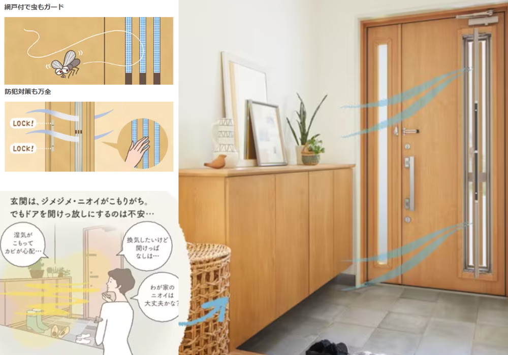 玄関は湿気や匂いがこもりがちですよね。涼しい時期には風通しを良くするために換気したくなることも。リシェントなら鍵を閉めたまま換気ができるので、防犯面も安心して換気ができます!採風も採光の機能も兼ね備えています。