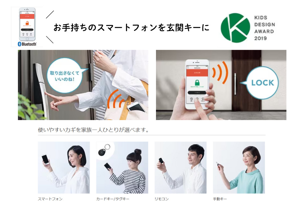 2019年度キッズデザイン賞 受賞したFamiLockは、スマートフォンやリモコン、カードキー、タグキーを使用して玄関ドアの施解錠を行うシステムです。同じドアで一人ひとりがカギのタイプを選ぶことができ、Bluetooth認証を採用し専用アプリを使えば施解錠履歴の確認も可能。FamiLockで家族の暮らしがさらに進化します。