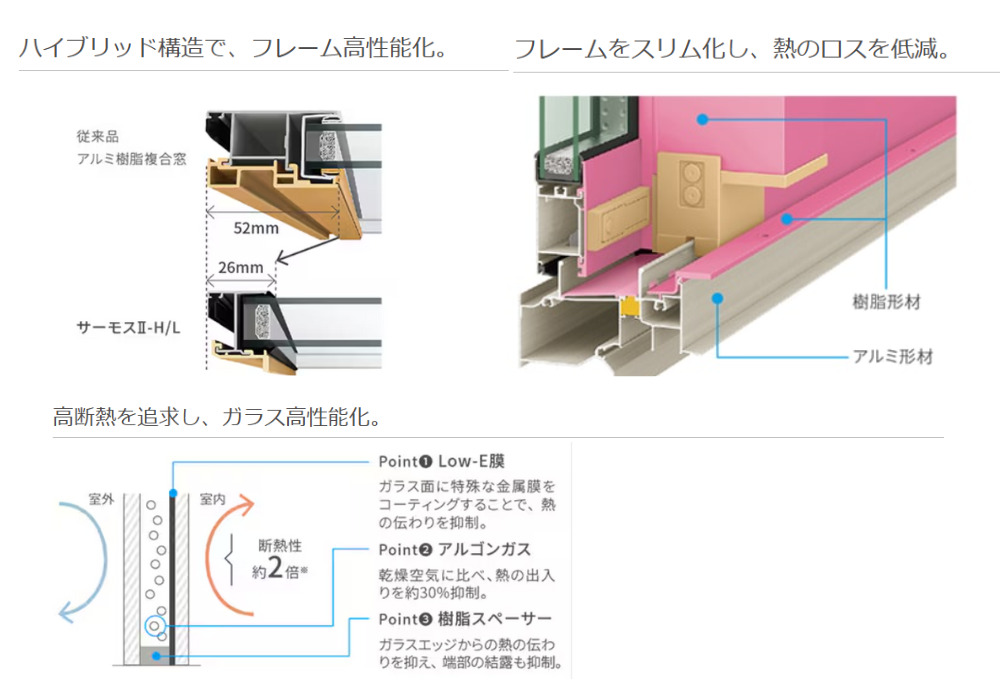 アルミと樹脂のハイブリッド構造で、優れた断熱性能を実現します。