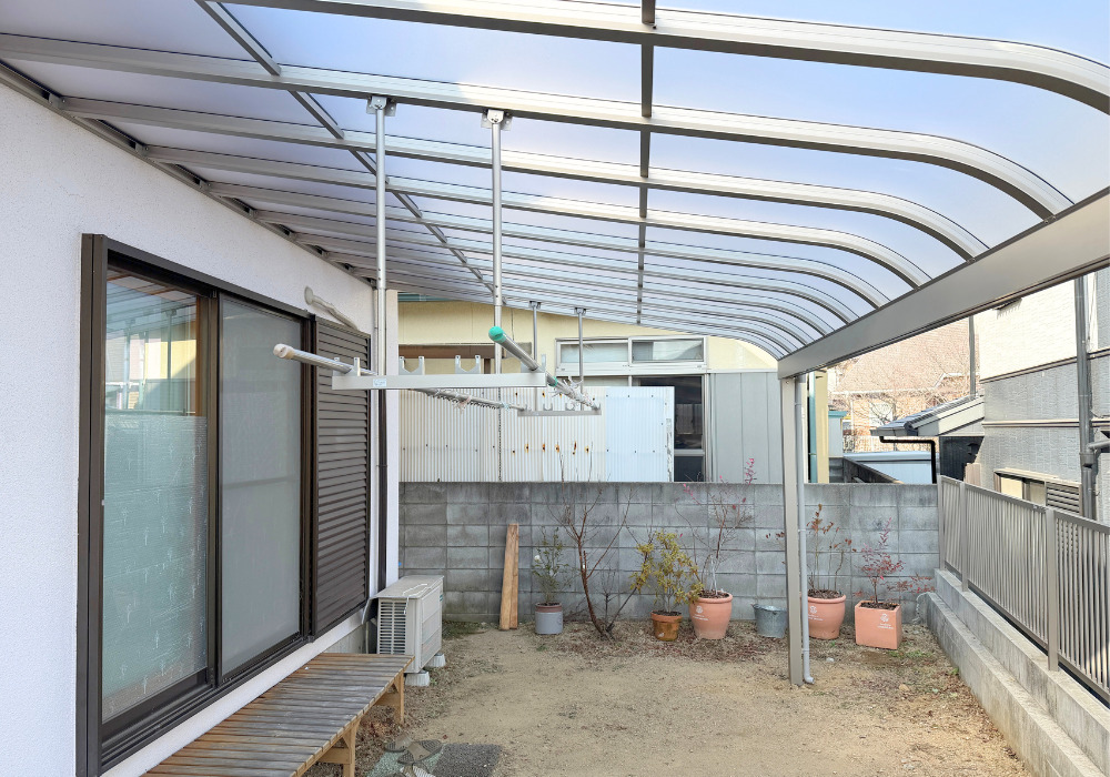 1階屋根の下から壁につけて設置しているため雨漏りの心配もなく、雨樋もあるので雨が落ちる音も気になりません。ポリカ屋根なので、直射日光は当たらずに適度に日の明かりが入ることもテラスをつけるメリットになります。