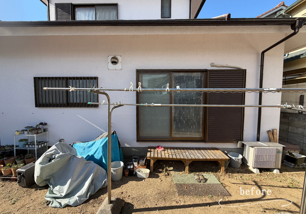 施工前に置いていた物干しは置き型だったため足元のスペースとられてしまっていましたが、吊り下げ式にすることでスペースが広がり有効活用できるようになりました。