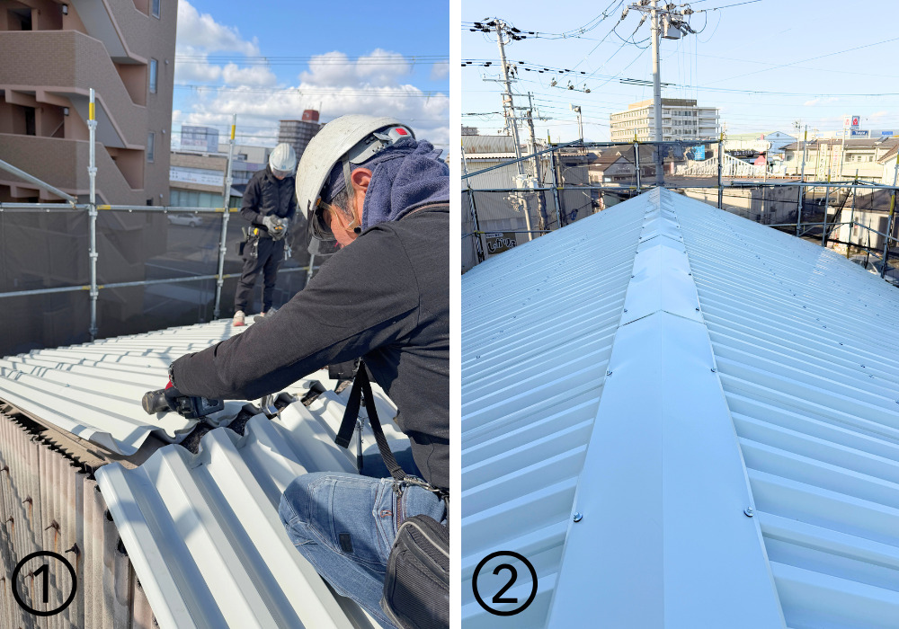 ①屋根を上から重ねていく作業の様子です。