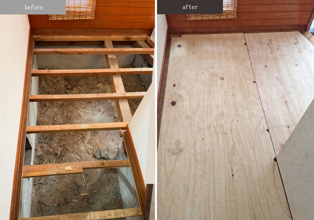 • まずは施工する廊下の既存の床を全て剥がして、新しく下地の合板を施工していきます。