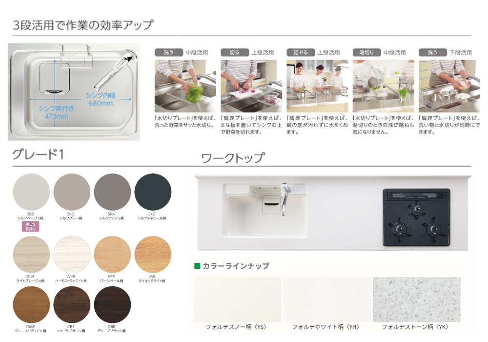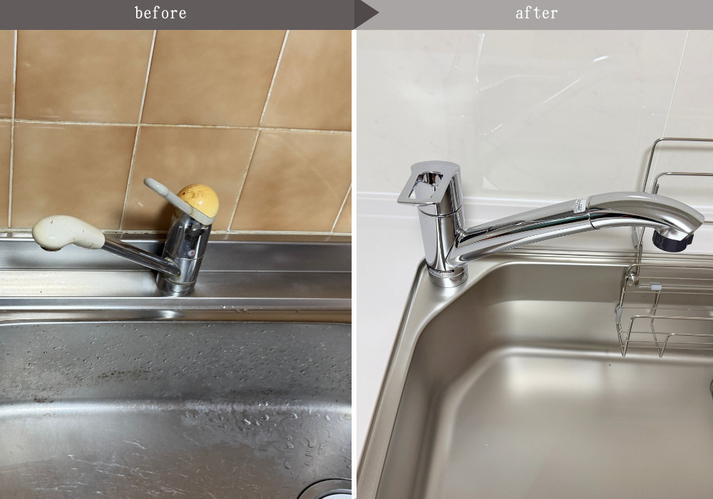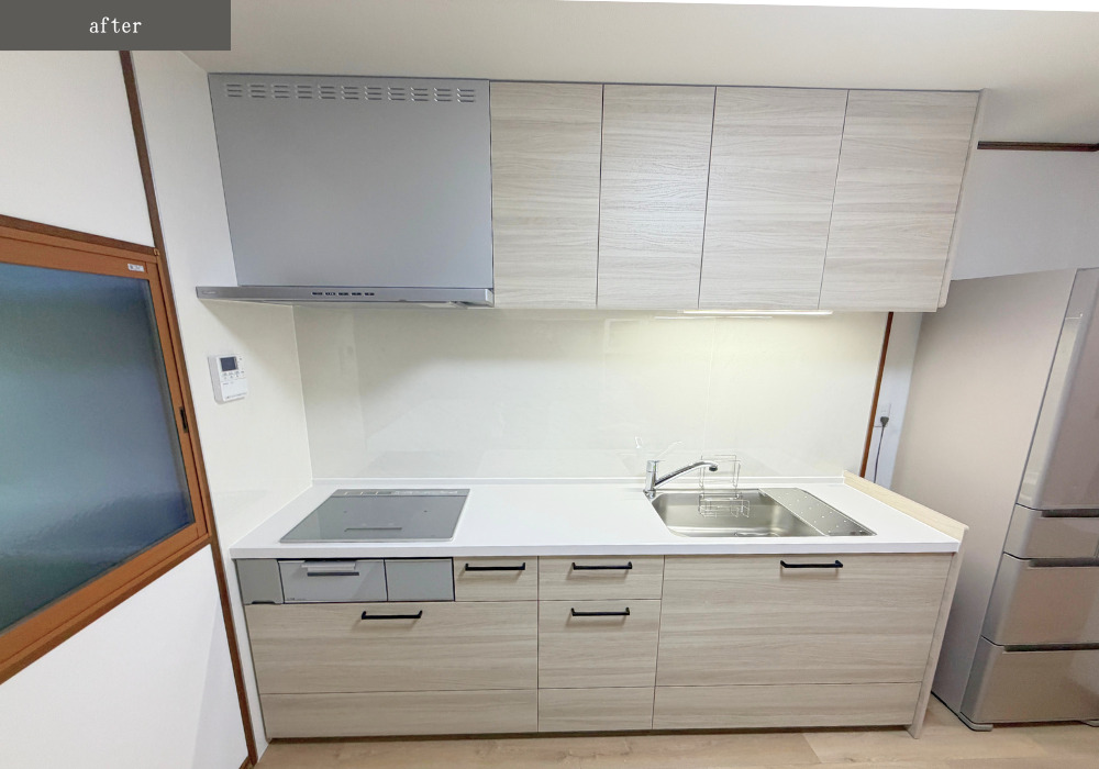以前よりも明るめのカラーを採用されました。壁付けタイプはそのままで、レンジフード/コンロ/水栓は節水タイプのものを取り付けました。 -