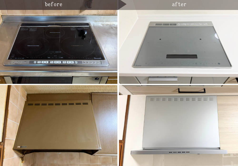レンジフードはフラット型でスマートに、コンロは新しいIHのものです。両方シルバーなので新しいキッチンにしっかり馴染んでいます。