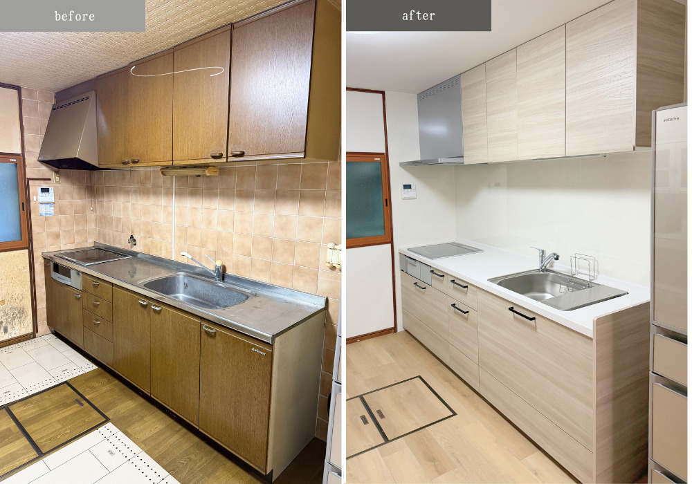 正面から見てもスッキリと収まり、出し入れしやすい収納も増えました。クロスも張り替えて綺麗にし、キッチンはフロアのカラーと同系色にしたため圧迫感が軽減され空間がより広く見えるようになりました。 -