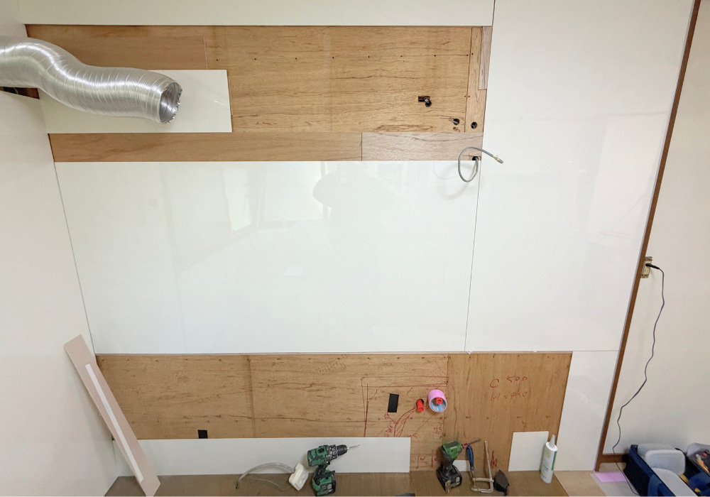 解体が終わると、新しいキッチンの吊戸棚裏の下地造作や、換気ダクト、配線工事などの工事をします。