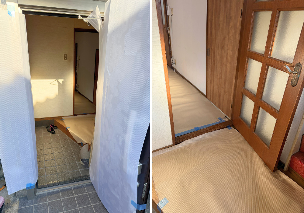 施工をする前は、壁や家具などに傷をつけないように、きちっと養生を行います。