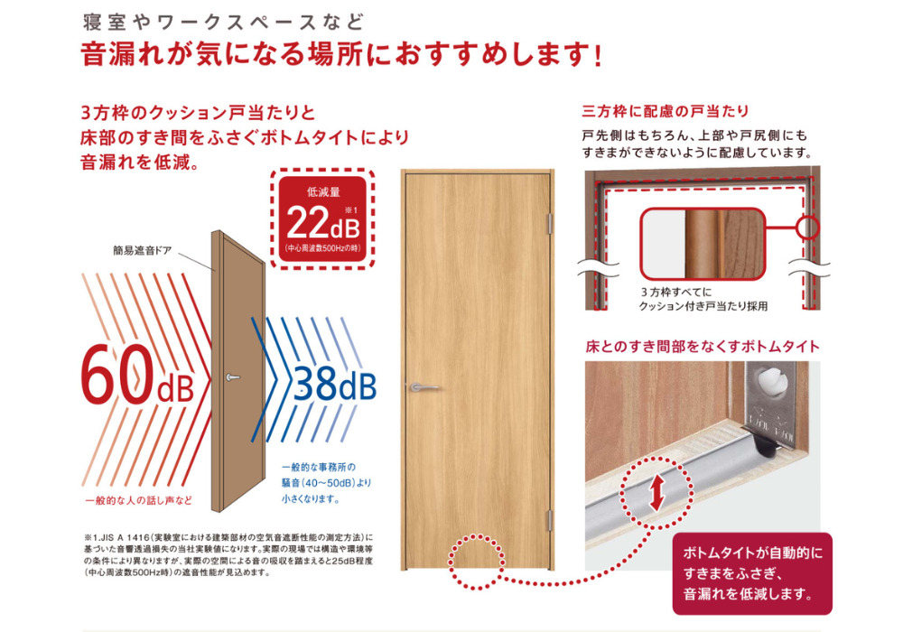 外に繋がる空間の主な2か所のドアに設置することで防音効果が更にアップします。